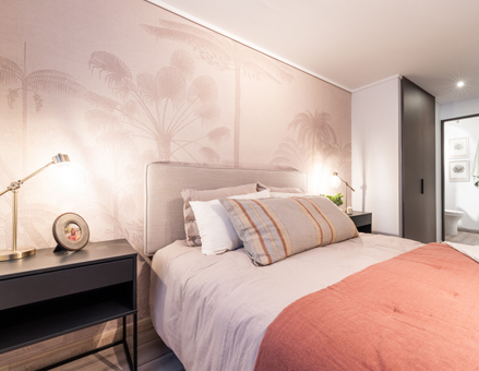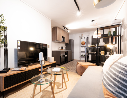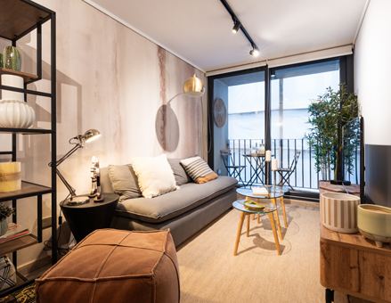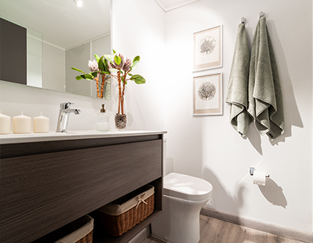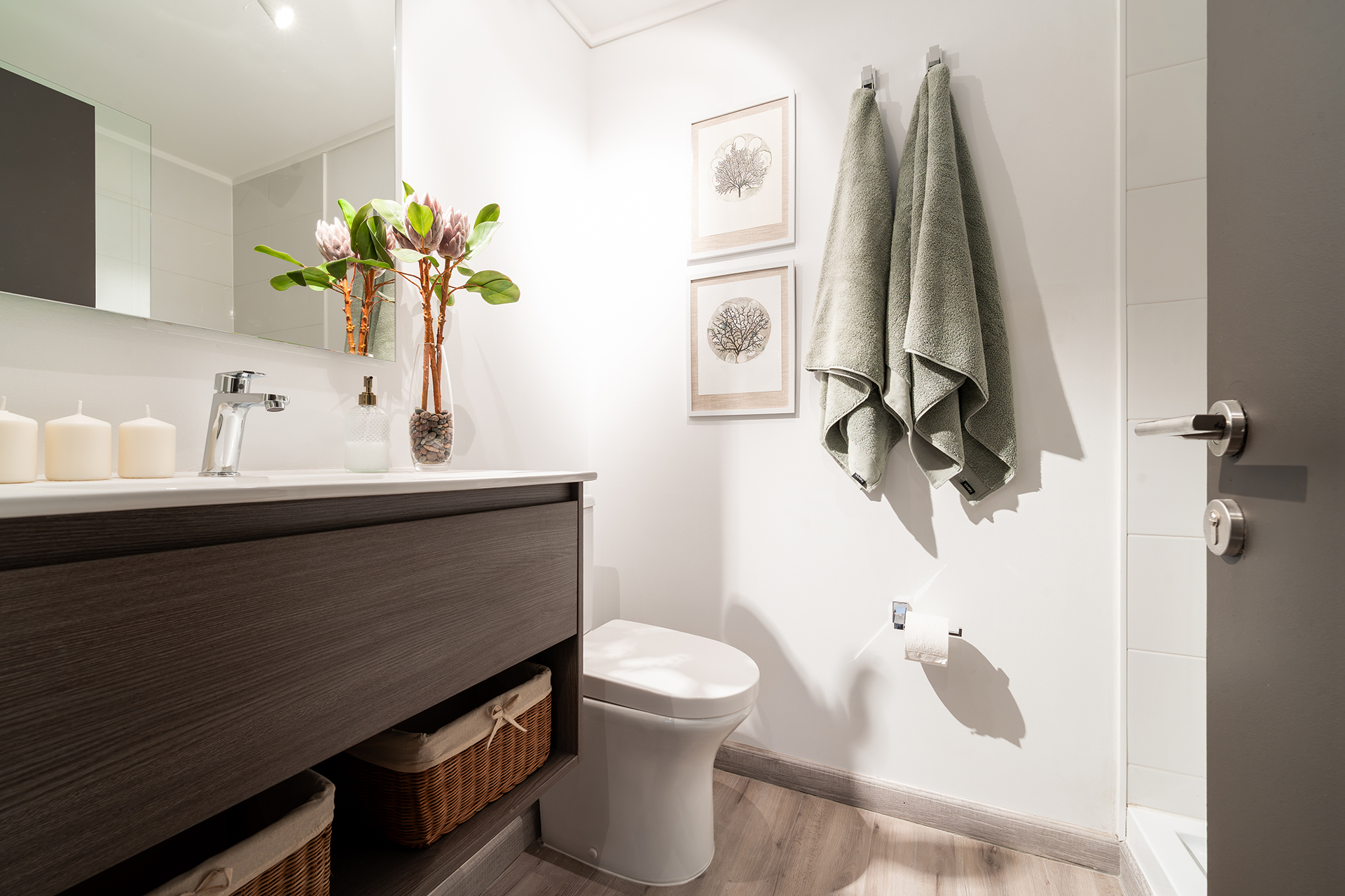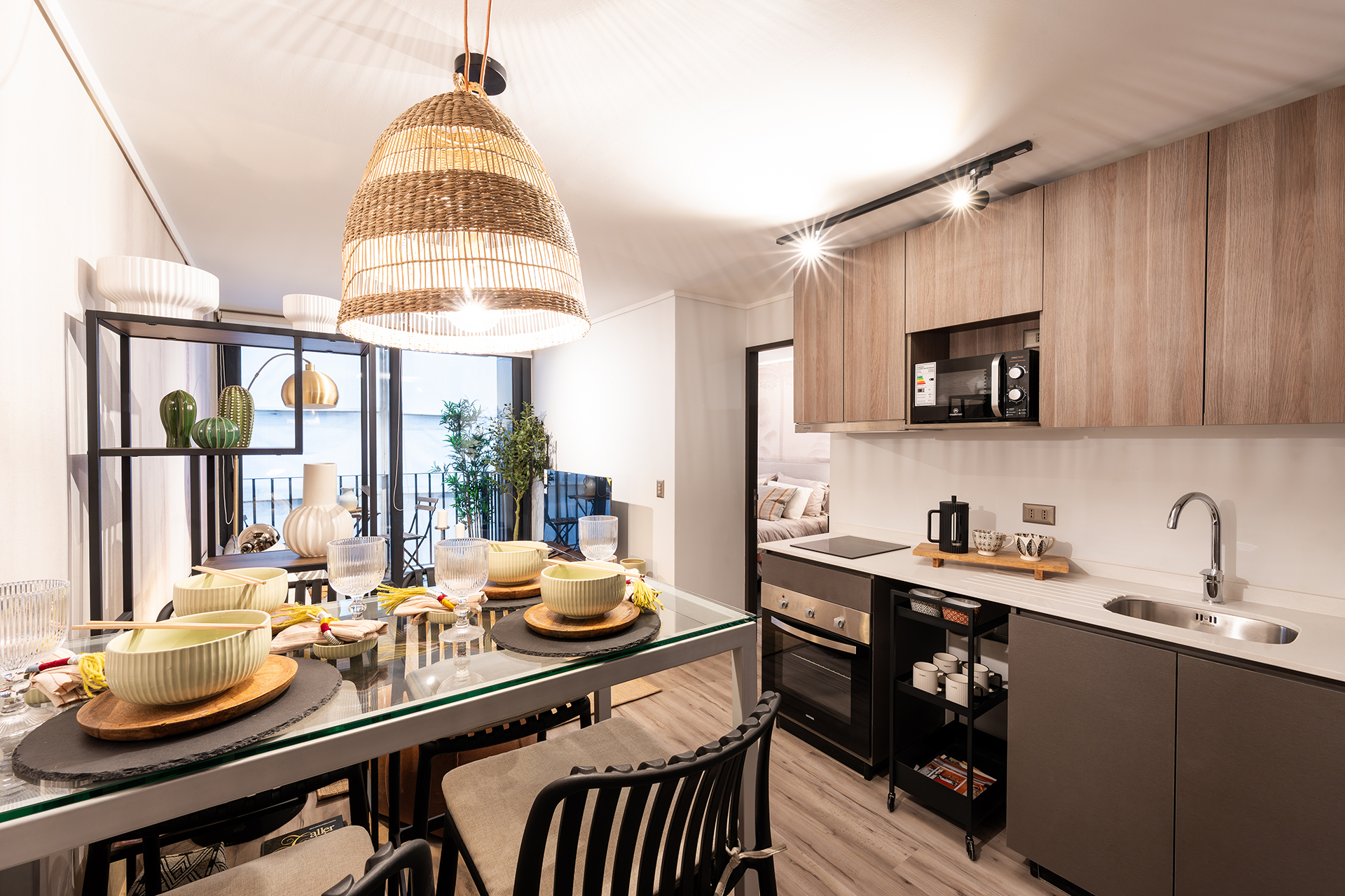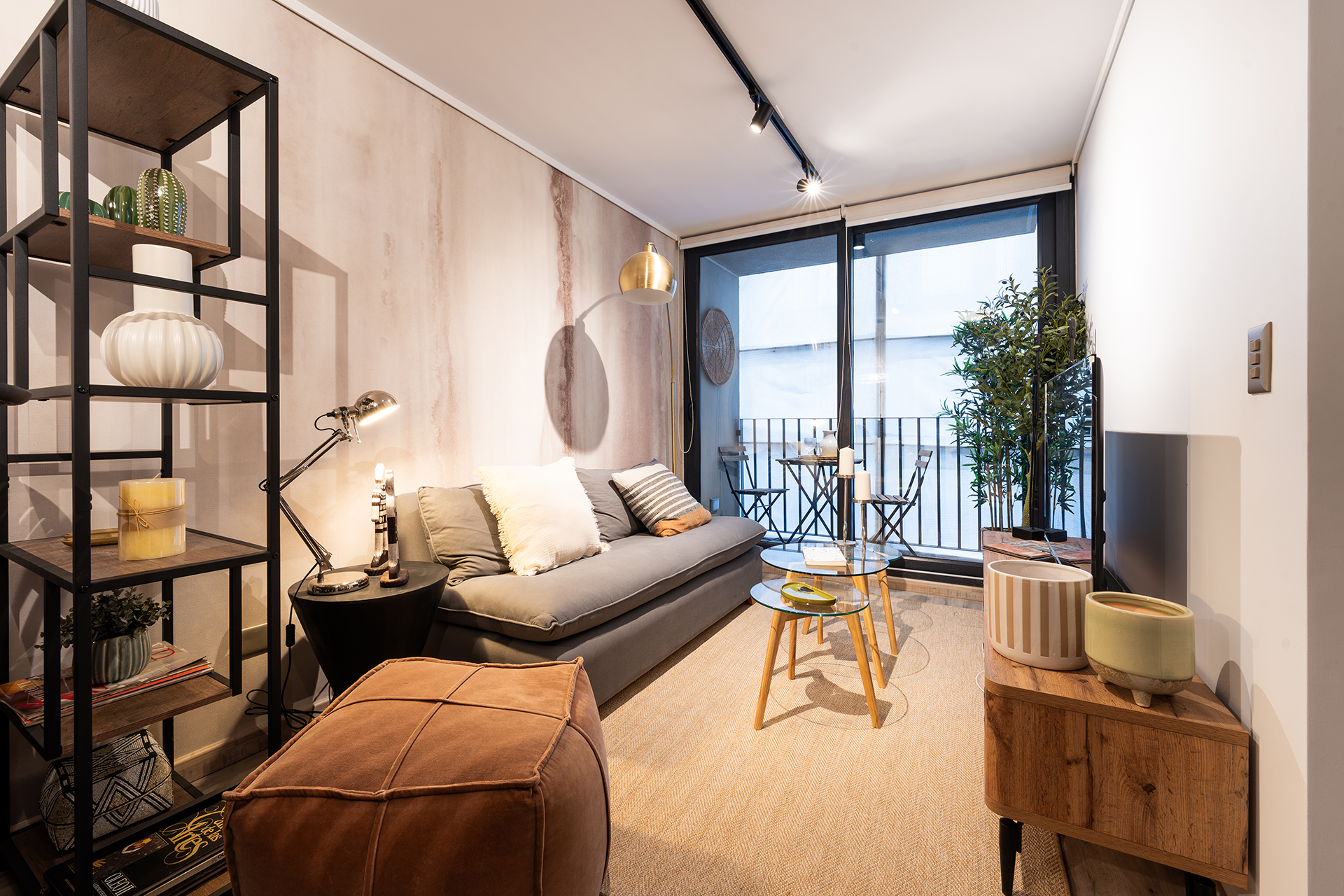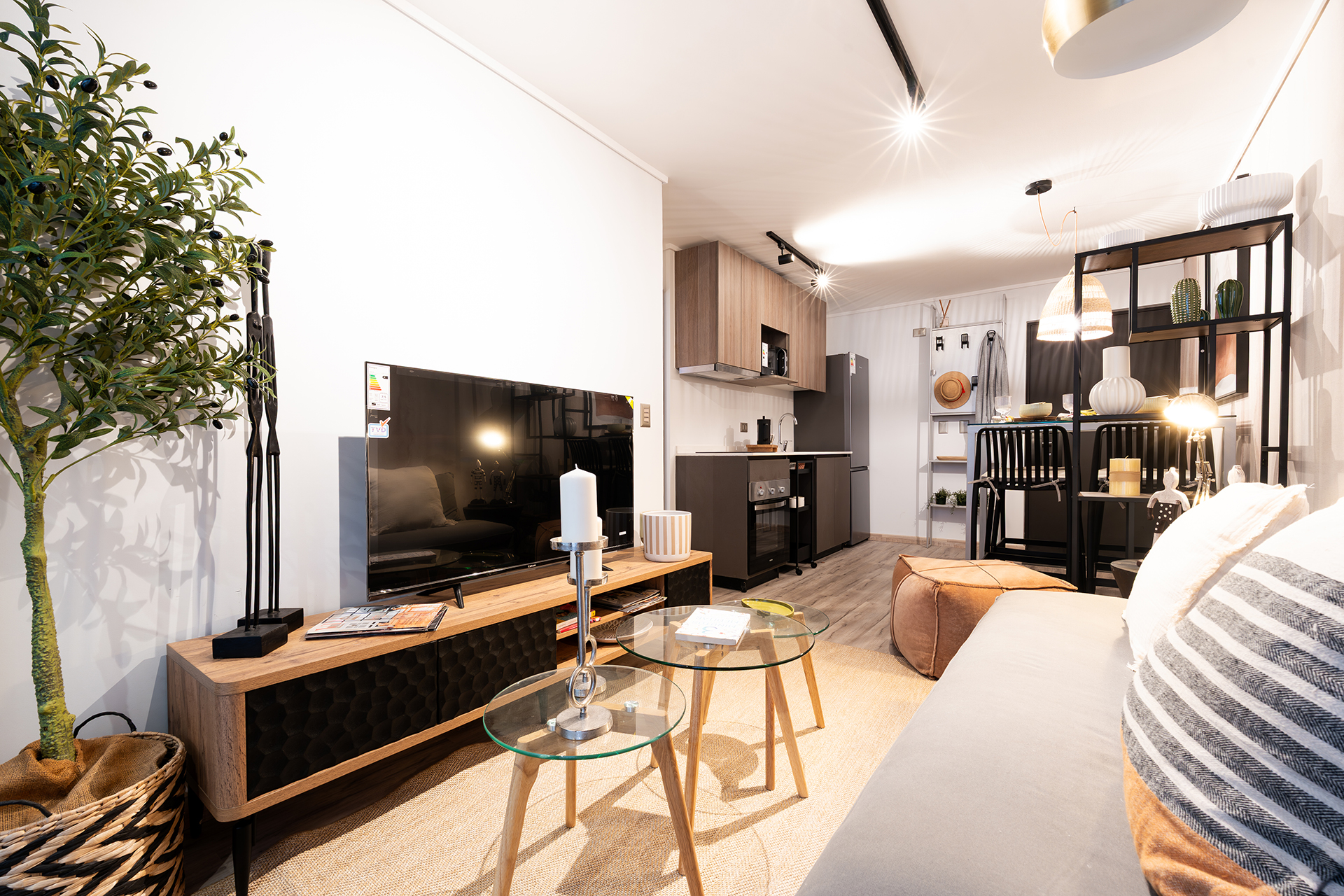 Privilegiamos una arquitectura moderna que entregue espacialidad, funcionalidad y bajos gastos comunes. Para ello, definimos cómodos espacios comunes con una conserjería y un Cowork en primer piso, una Terraza con dos ambientes y quinchos en el quinto piso y Ascensor.